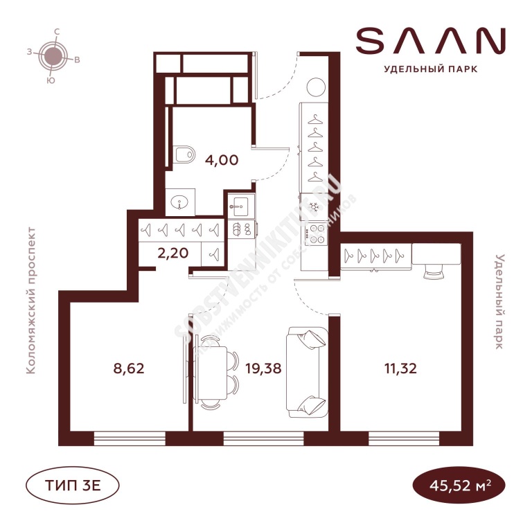 Площадь — 45.52/39.32 м2 общая/жилая