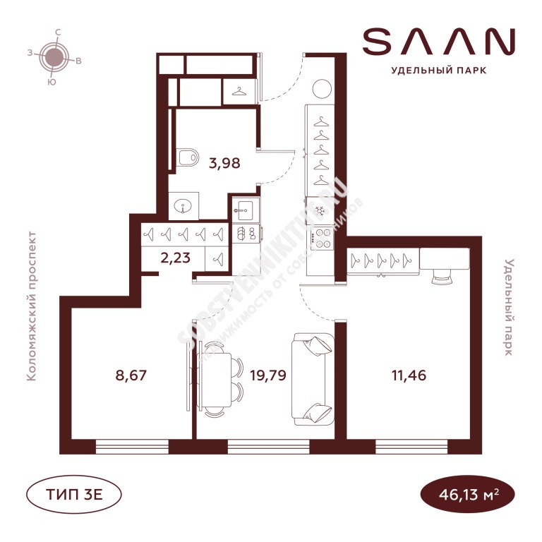 Площадь — 46.13/39.92 м2 общая/жилая