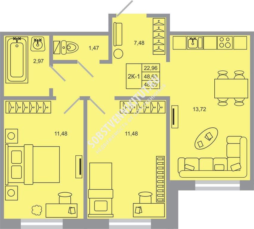 Площадь — 48.6/22.96/13.72 м2 общая/жилая/кухня