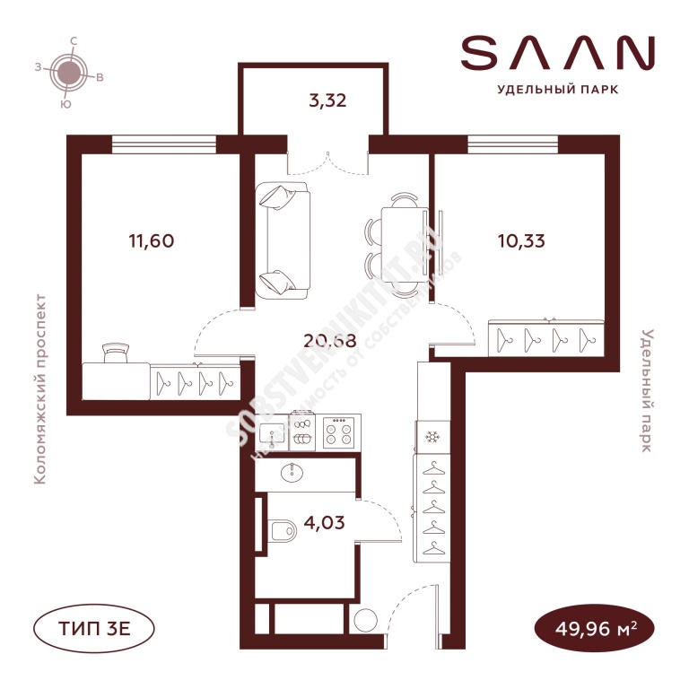 Площадь — 49.96/42.61 м2 общая/жилая