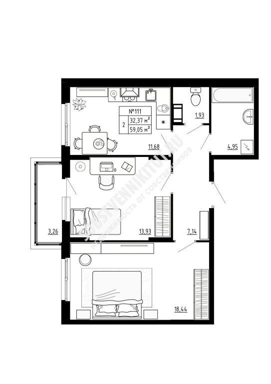 Жилая площадь 47.24 м2, квартира без отделки.