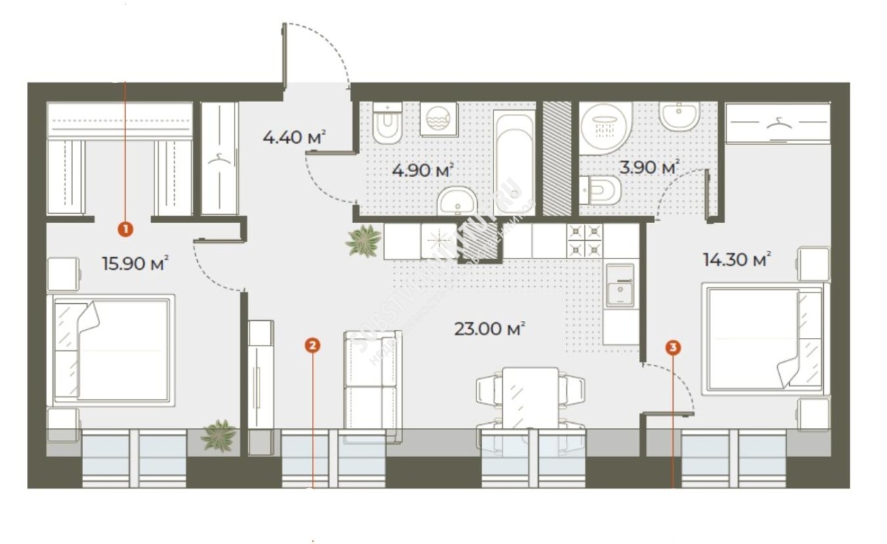 Площадь — 66.4/30.2/23 м2 общая/жилая/кухня