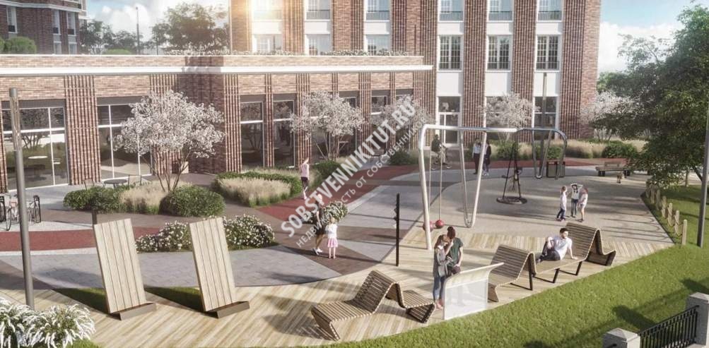 Закрытый двор расположится на стилобате, что обеспечит жильцам дополнительную приватность. На территории будут проложены гранитные дорожки, разбиты клумбы с элементами ландшафтного дизайна, высажены деревья, установлены скамейки. Во двор будут выходить террасы квартир на втором этаже (первый жилой) , где жильцы смогут организовать собственный палисадник