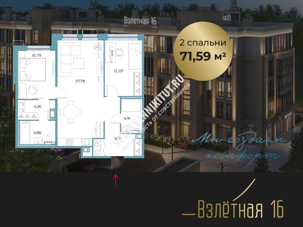 Общая площадь квартиры составляет 71,59 м2, из которых 27,78 м2 отведено под просторную кухню-гостиную с двумя окнами. Мастер спальня 10,79 м2 со своей гардеробной и сан.узлом. вторая спальня площадью 12,07 м2. Предусмотрено место под прачечную.