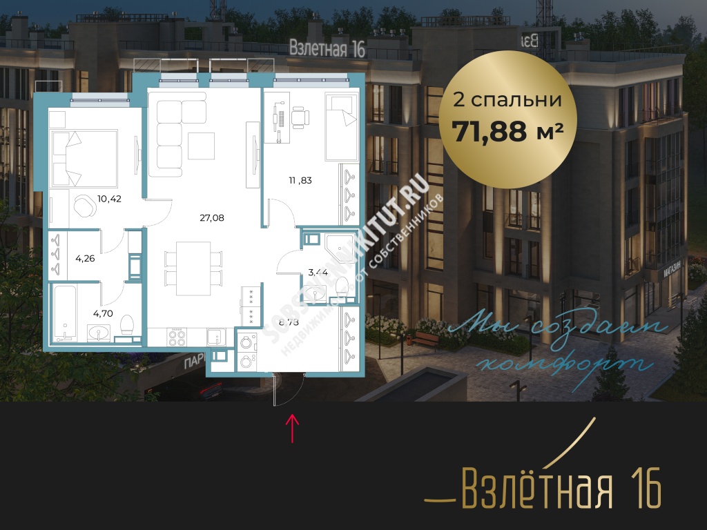 Общая площадь квартиры составляет 71,88 м2, из которых 27 м2 отведено под просторную кухню-гостиную с двумя окнами. Мастер спальня 10,42 м2 со своей гардеробной и сан.узлом. вторая спальня площадью 12,07 м2. Предусмотрено место под прачечную.