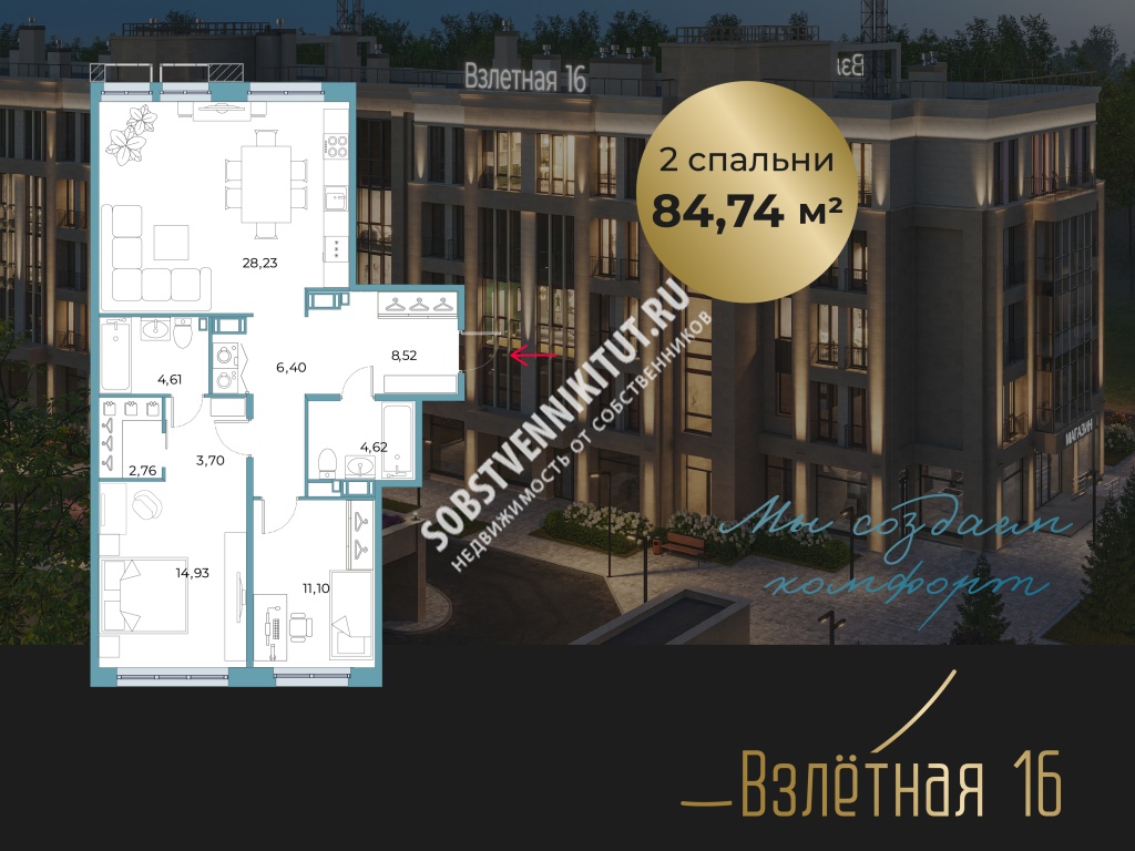 Площадь — 84.74/24.93/28.23 м2 общая/жилая/кухня