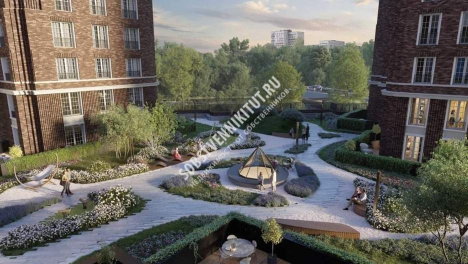 Закрытый двор расположится на стилобате, что обеспечит жильцам дополнительную приватность. На территории будут проложены гранитные дорожки, разбиты клумбы с элементами ландшафтного дизайна, высажены деревья, установлены скамейки. Во двор будут выходить террасы квартир на втором этаже (первый жилой) , где жильцы смогут организовать собственный палисадник