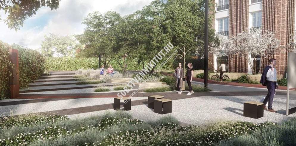 Закрытый двор расположится на стилобате, что обеспечит жильцам дополнительную приватность. На территории будут проложены гранитные дорожки, разбиты клумбы с элементами ландшафтного дизайна, высажены деревья, установлены скамейки. Во двор будут выходить террасы квартир на втором этаже (первый жилой) , где жильцы смогут организовать собственный палисадник
