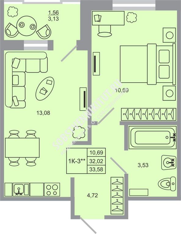 Площадь — 33.58/10.69/13.08 м2 общая/жилая/кухня