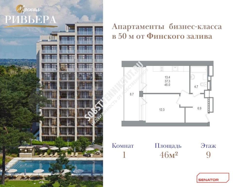 1-к квартира, 46м2, 9/12 эт
