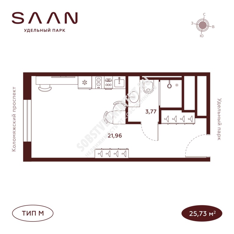 Площадь — 25.73/21.91 м2 общая/жилая
