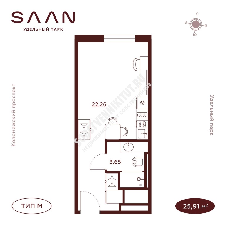 Площадь — 25.91/22.33 м2 общая/жилая
